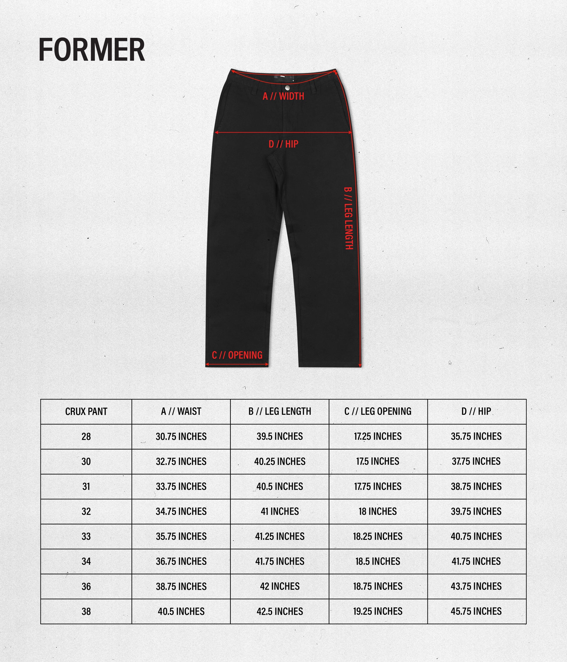 The Crux Pant is delivered in a straight fit with an 18" leg opening. Constructed from a premium and durable 100% denim and features a fixed waist, signature Crux logo back patch on waistband, Legacy logo woven flag label on back pocket, and FORMER branded metal shank button.