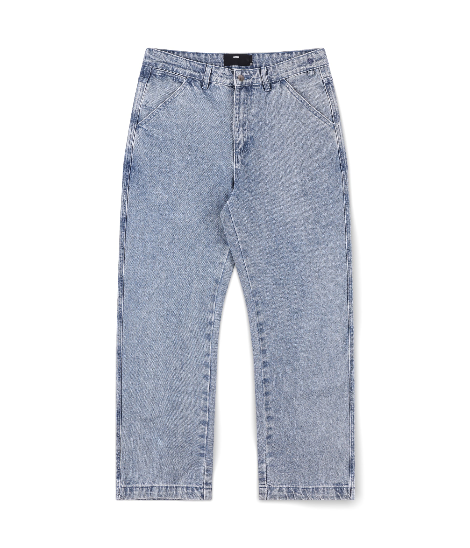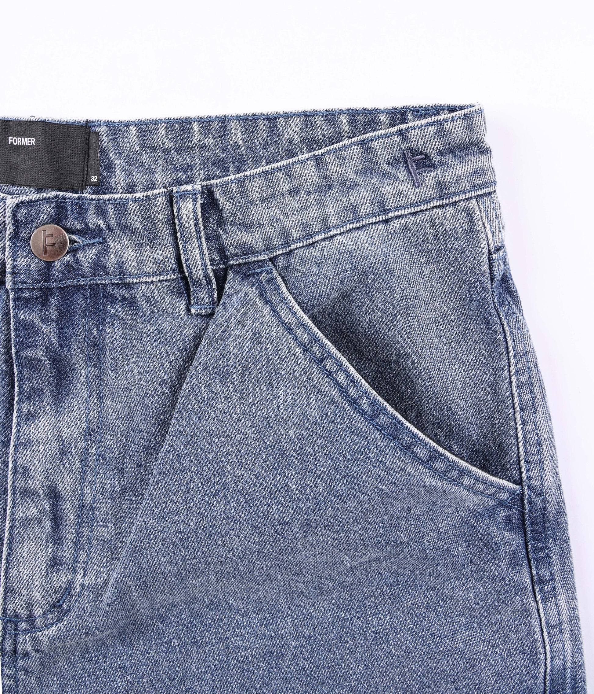 Crafted from 100% cotton denim with a vintage wash, these pants feature a distend fit with an 18.5-inch leg opening and a relaxed silhouette. Designed with functional workwear back pockets, slant front pockets, a Crux logo PU label on the back pocket, and a subtle F logo embroidered on the hip waistband.