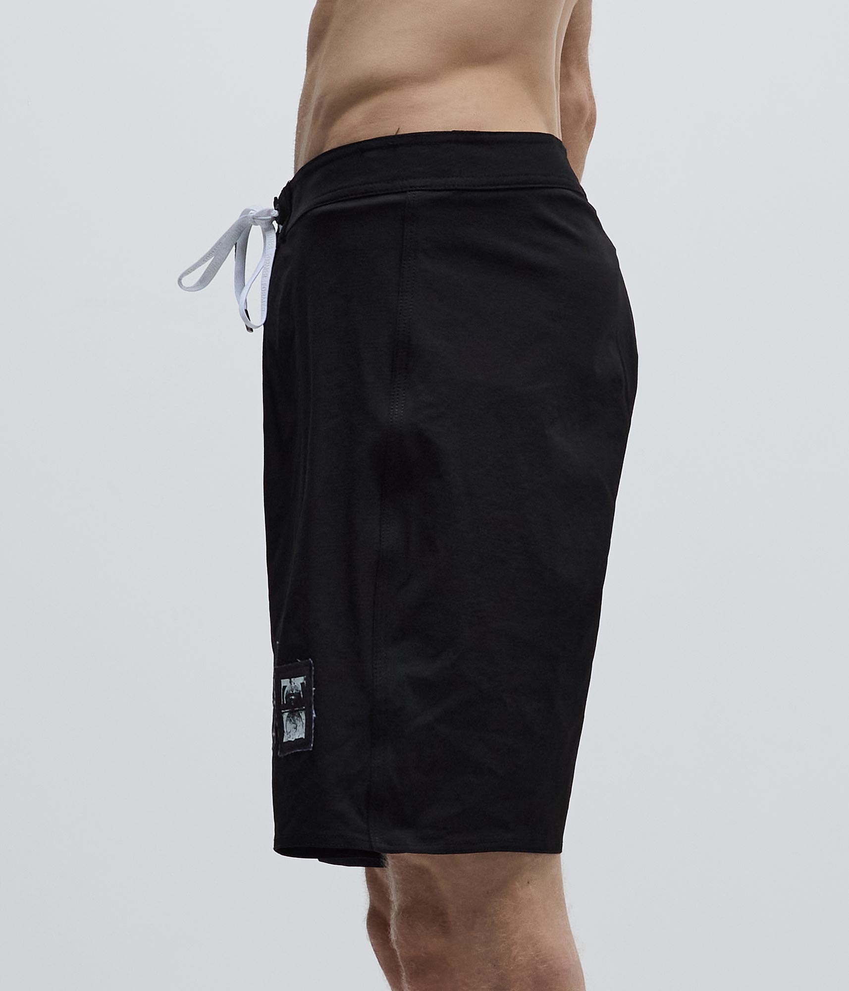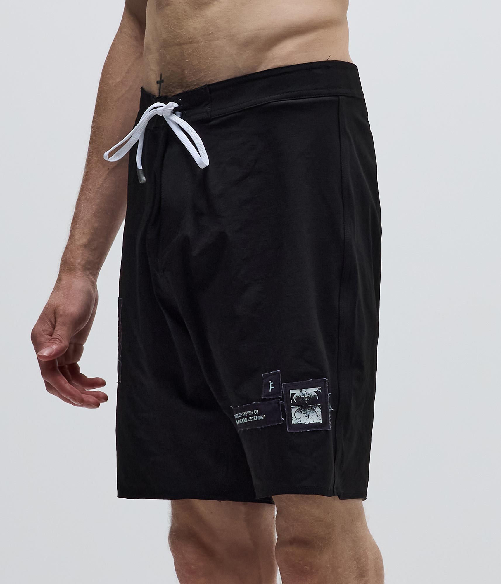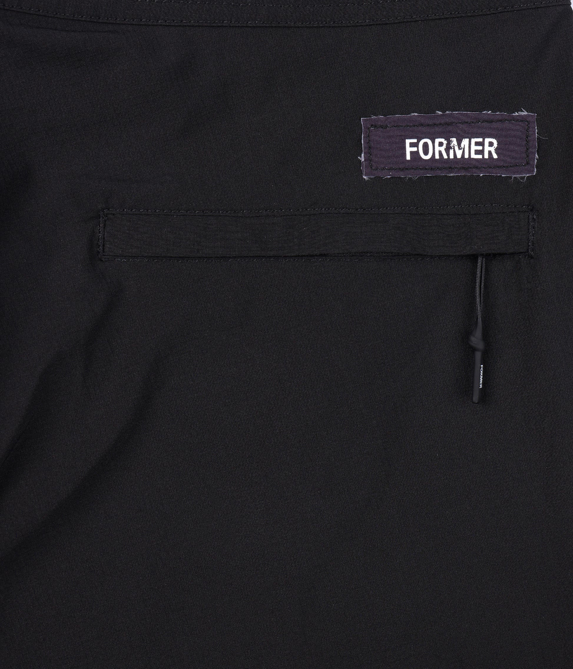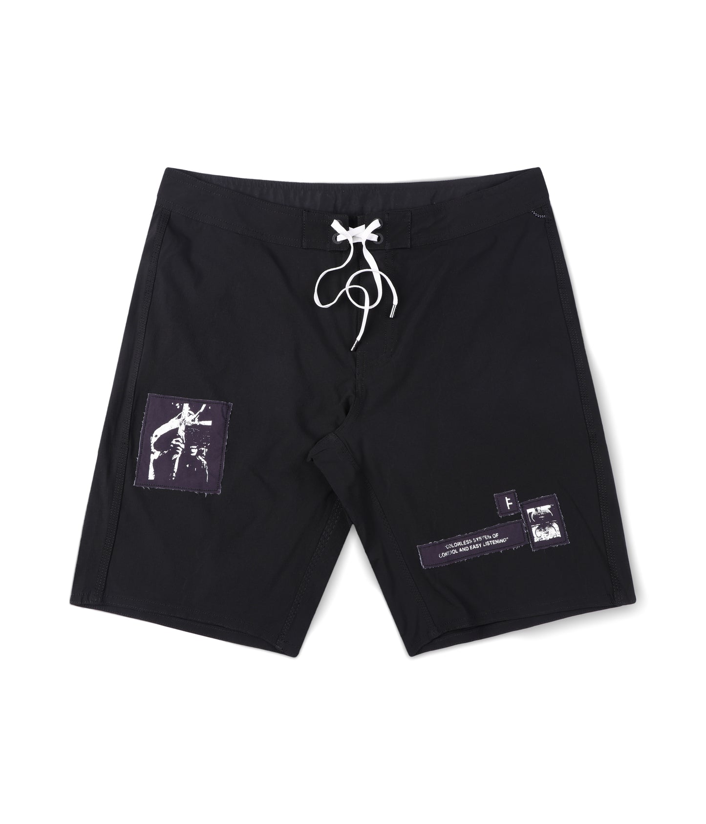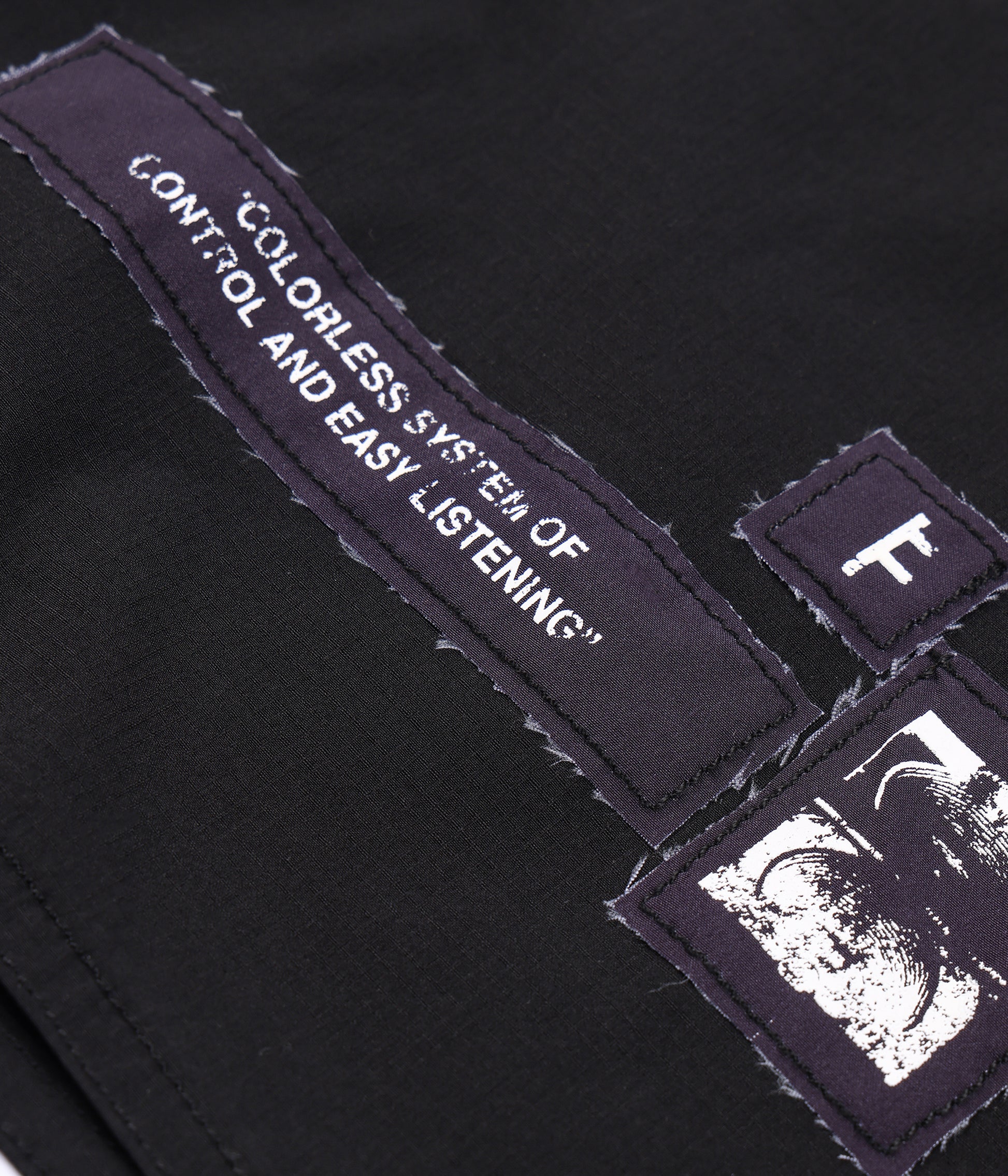 Constructed from durable nylon ripstop and delivered in our Standard 18" trunk fit. Featuring a multi raw edge patch detail, back welt zip pocket, and drawcord closure with Franchise F metal aglets.