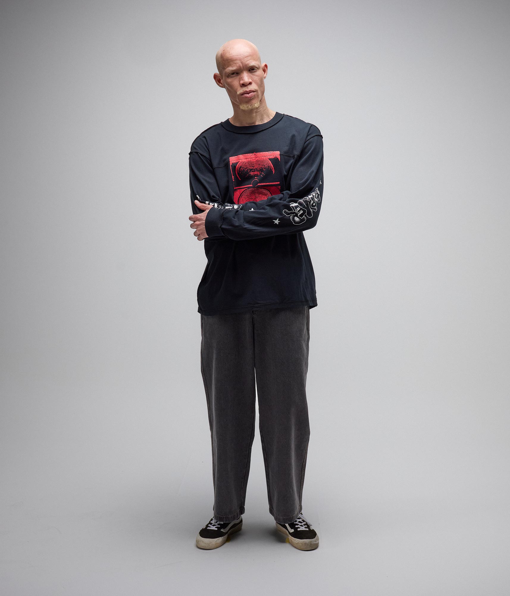 Delivered in a premium 200GSM jersey cotton and delivered in our standard FORMER long sleeve T-shirt block for a regular fit. Featuring inverted seams at collar and cuff and a cut and sew chest panels with cover stitch detail. Delivered with cracked print front graphic and sleeve graphics in a soft hand plastisol screen print.