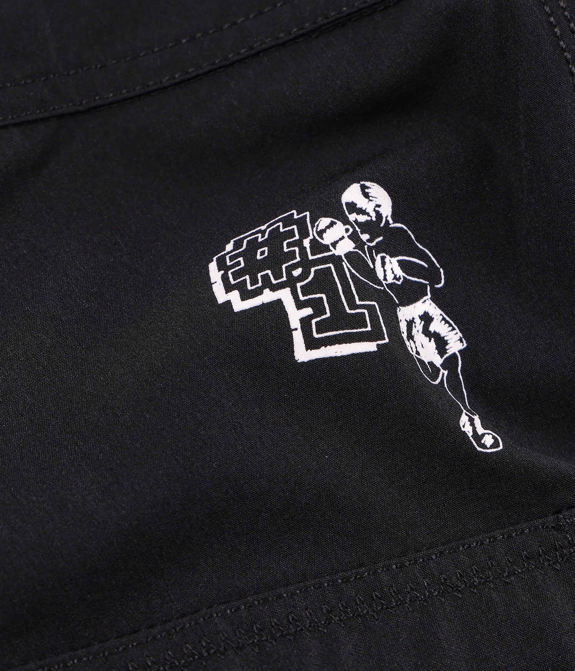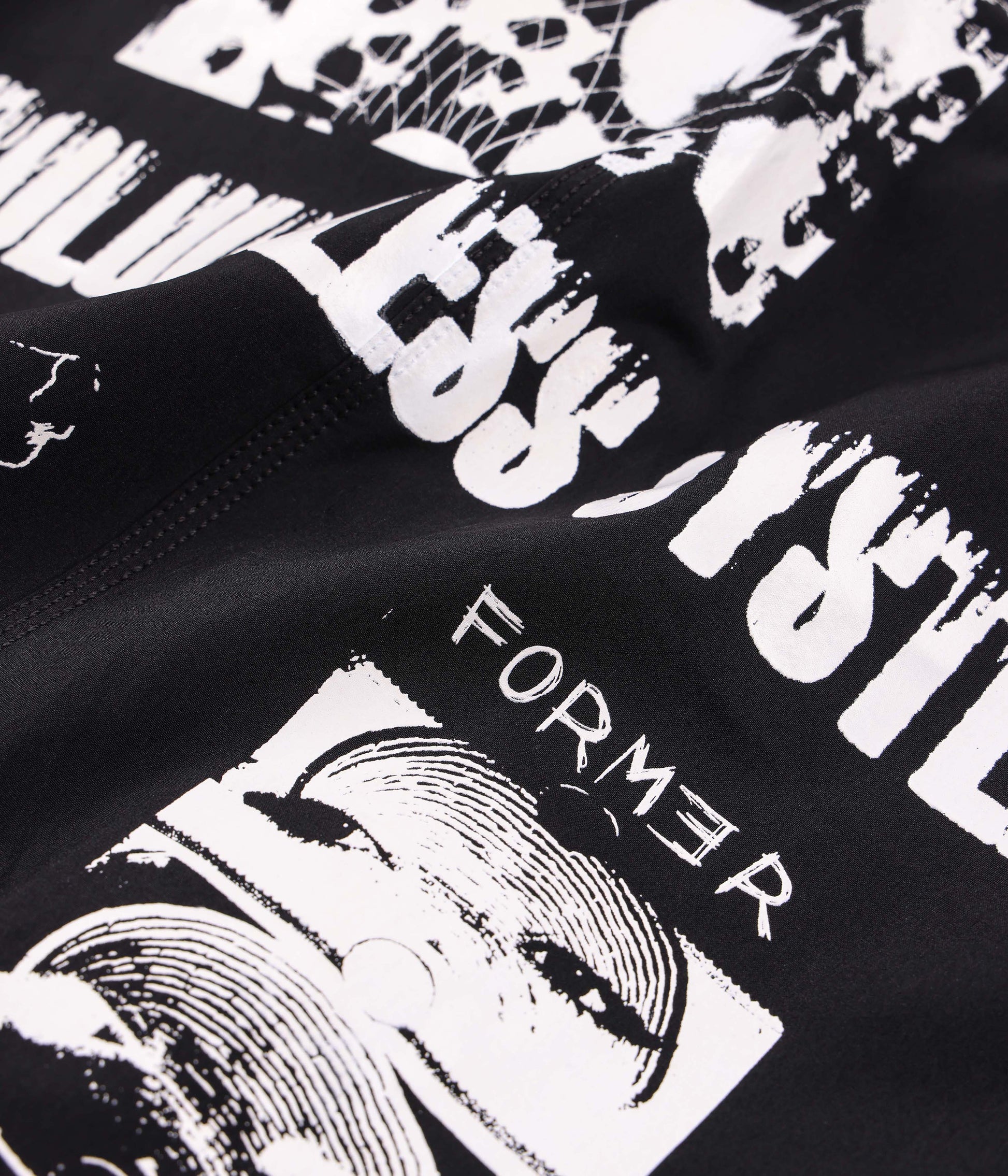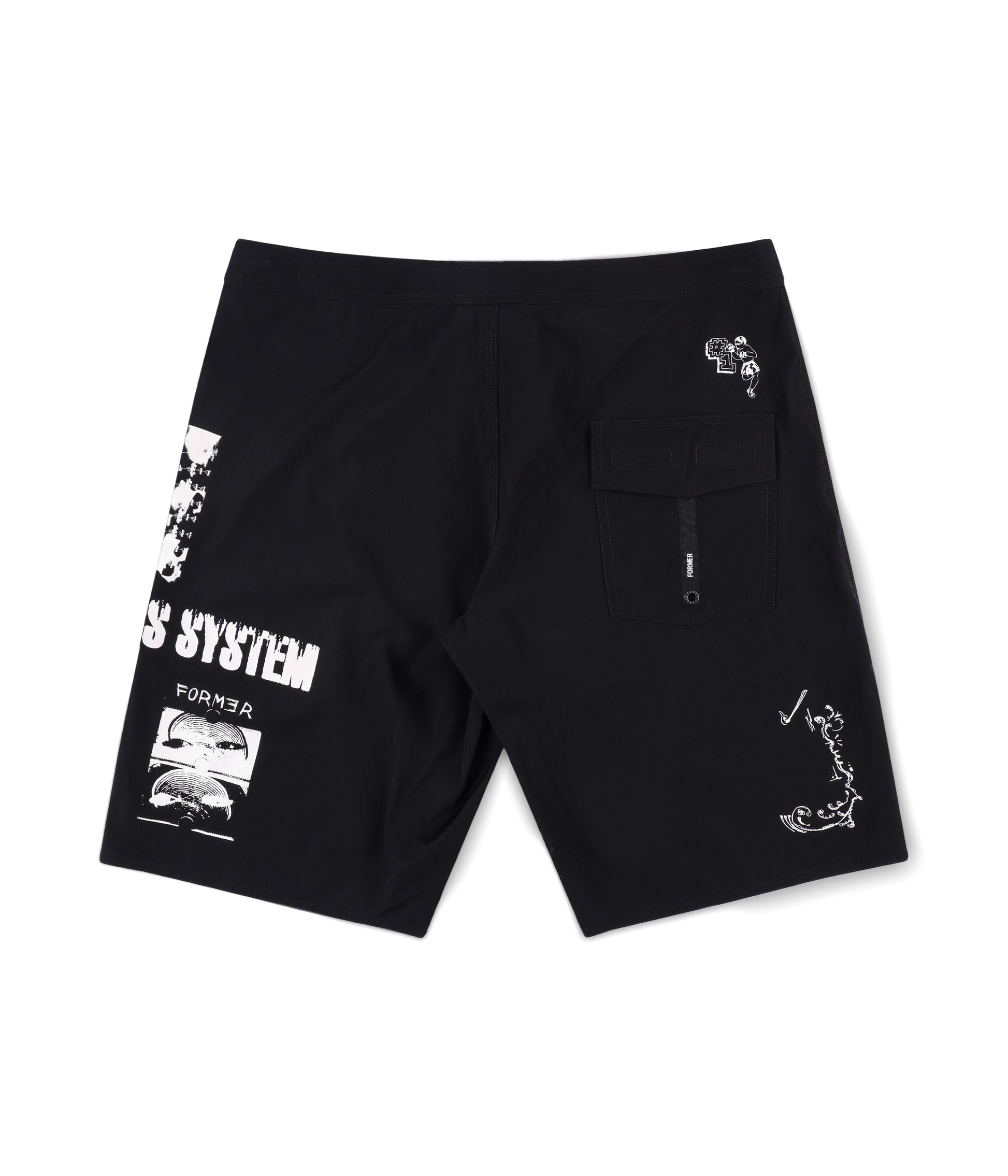Constructed from a soft poly-spandex blend with comfortable 4-way stretch and delivered in our standard 20" leg length fit. Featuring hand-drawn graphics by artist Edouard Depaz in a soft plastisol screen print. Finished with a fixed waist closure, secure velcro back patch pocket, and a pre-wash finish.
