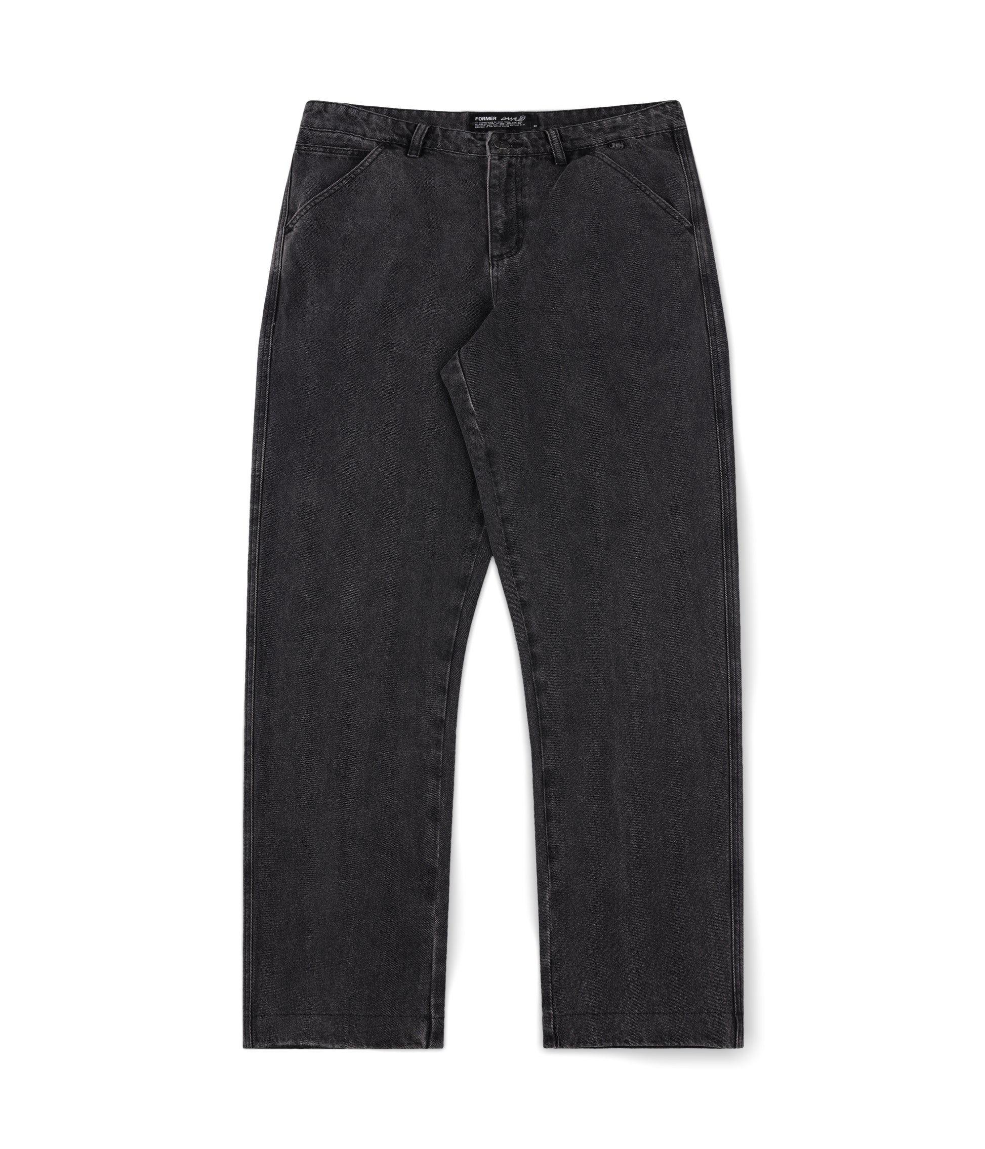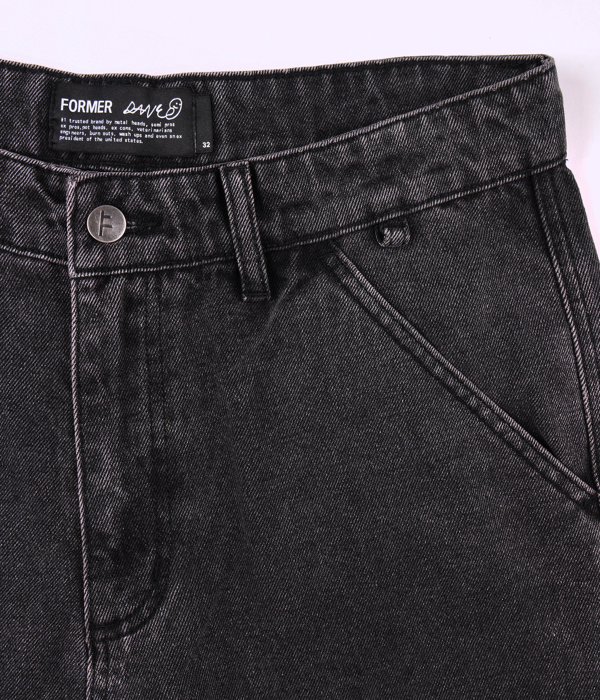 Designed by FORMER founder Dane Reynolds, the Reynolds Work Pant is our best selling baggy fit with a wide silhouette and 19” leg opening. Constructed in a durable 100% washed denim fabric, featuring a fixed waist, seasonal pop colour embroidery graphic on back pocket, double workwear pockets, and FORMER branded metal shank button.