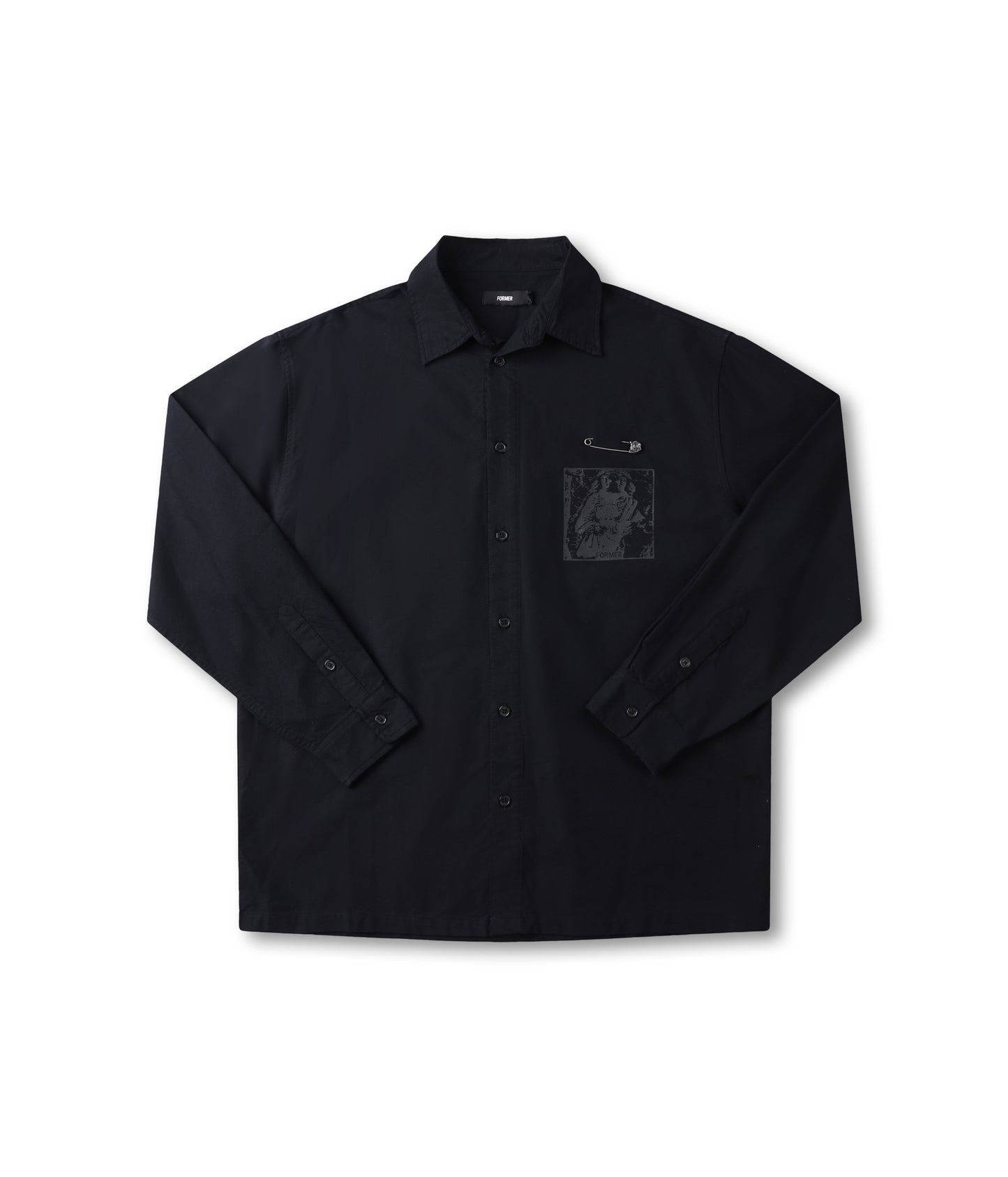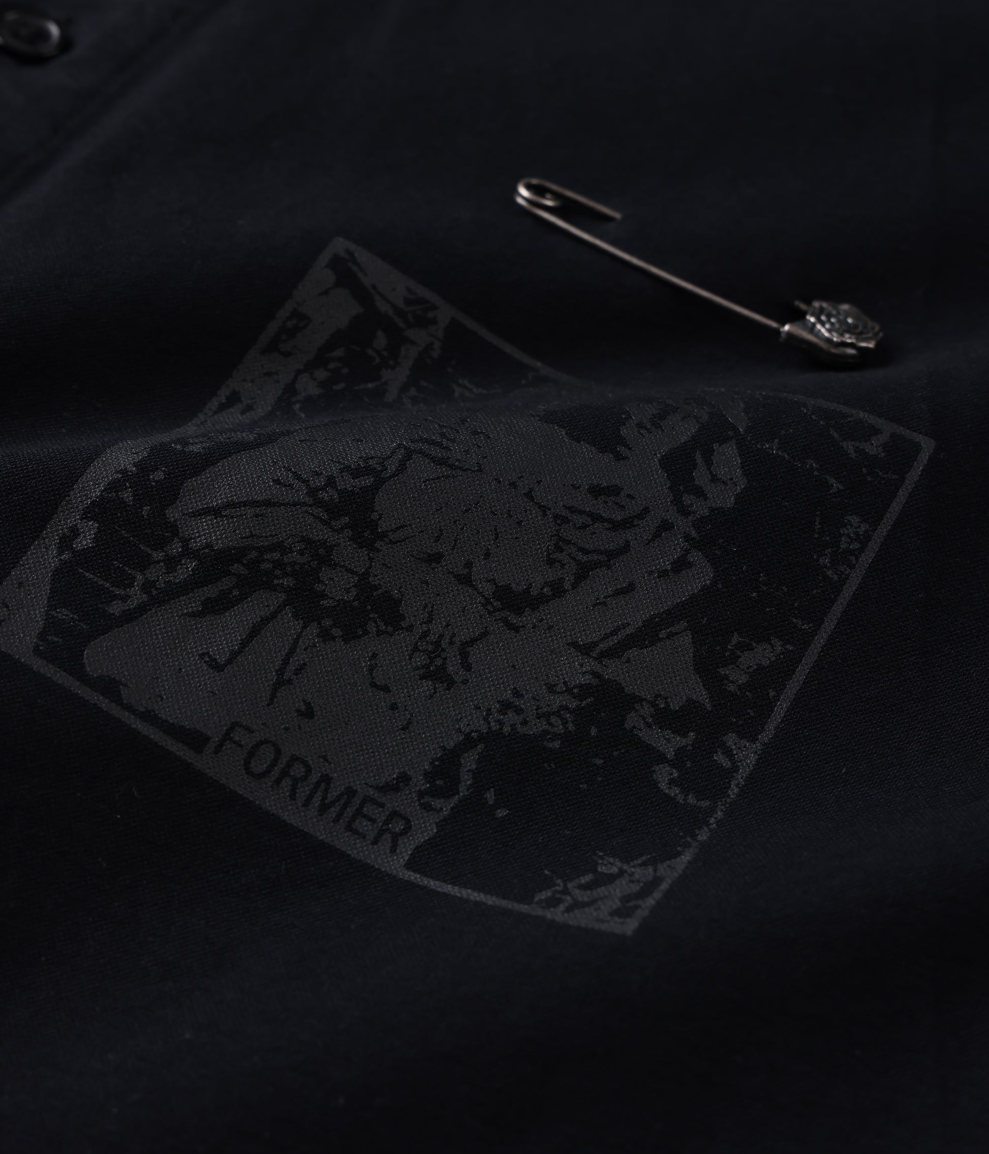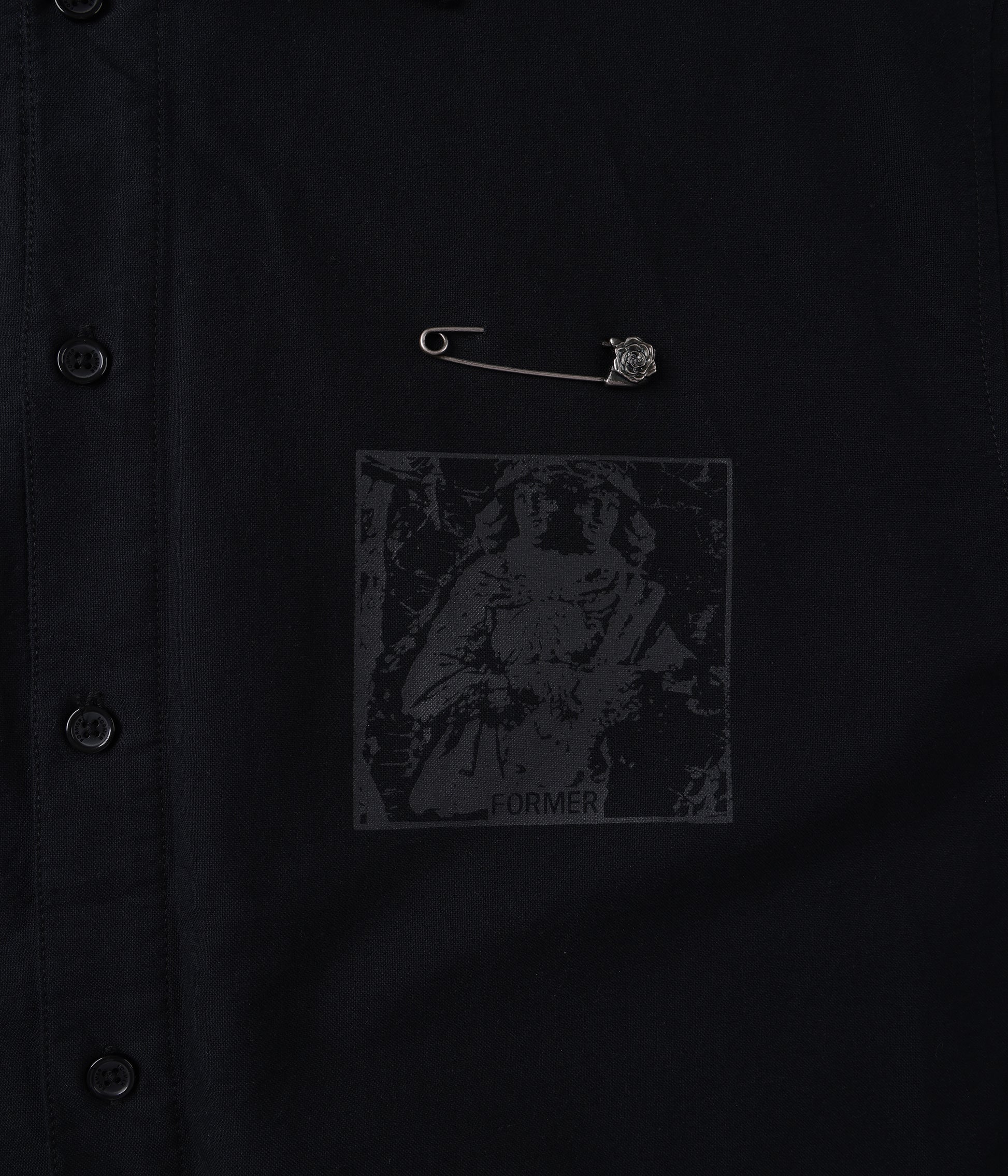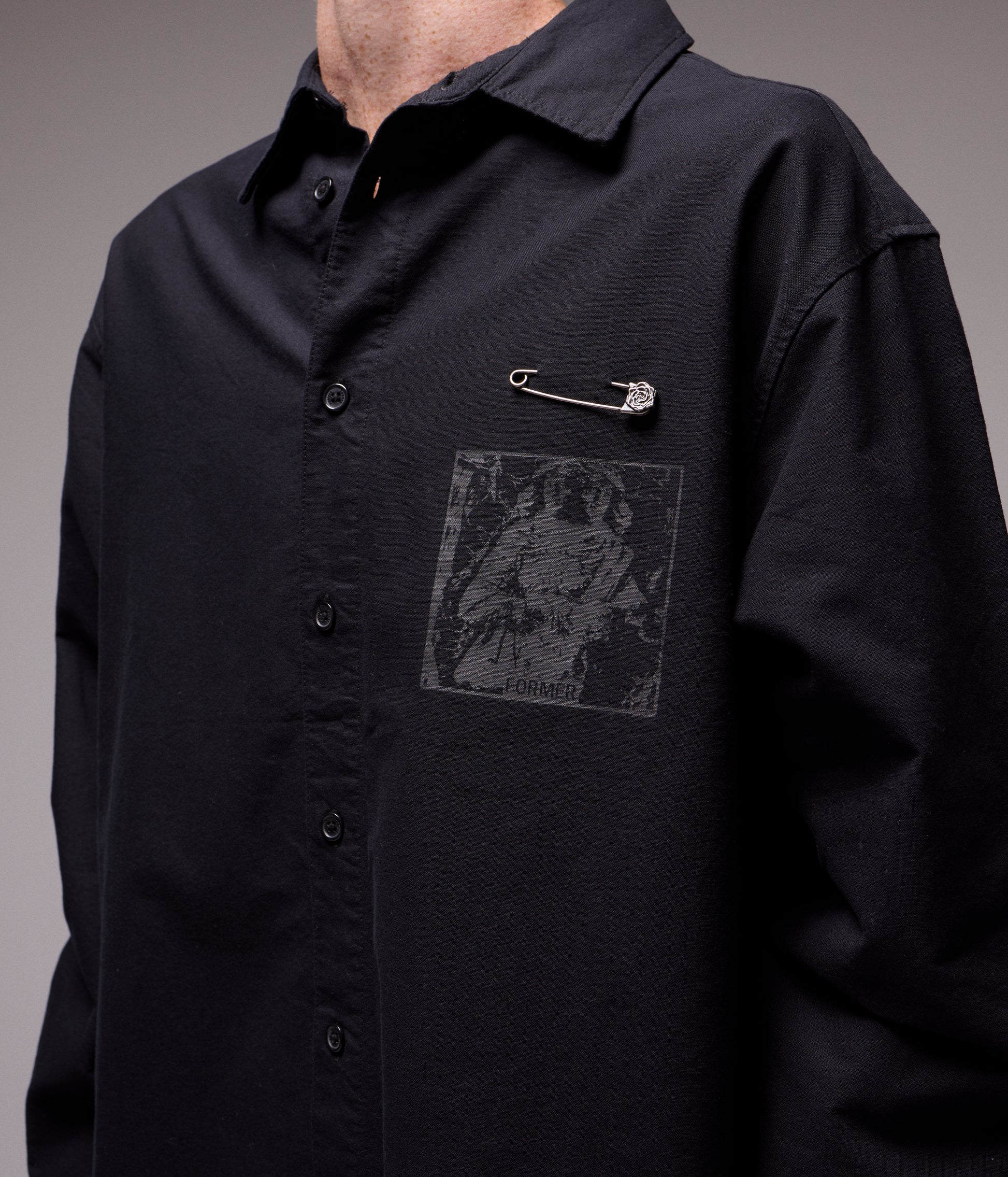Designed in 100% cotton oxford fabric and delivered in our best selling Vivian fit. Featuring seasonal front screen printed graphic. our signature FORMER rose pin, and button closure.